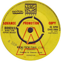 · There's a variant of the single with the title misspelled as Ricki Ticki Tavi. Is a promo edition with the same catalogue number, presumably sent in advance to radio stations, etc. The single has a yellow label, with the note "ADVANCE PROMOTION COPY" stamped in red print on both sides. Side A has a big red letter A, and a date stamp: 4 SEP 1970. |