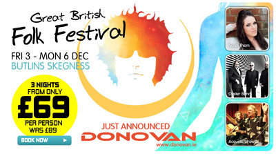 It just has been announced that Donovan will be headlining The Great British Folk Festival, to be held at the Butlins Resort, Skegness, Lincolnshire, 3rd-6th December. Other artists appearing at the Festival are folk supergroup The Gathering (with current and/or former member of Lindisfarne, Steeleye Span, Jethro Tull, Fairport Convention and Magna Carta), Jiggery Pipery, Acoustic Strawbs, Oyster Band, Sandi Thom, Kate Rusby and more.