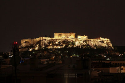 · View of the Acropolis from the roof restaurant of the Hellenic American Union at a magical dinner in Donovan's honor after the opening reception.