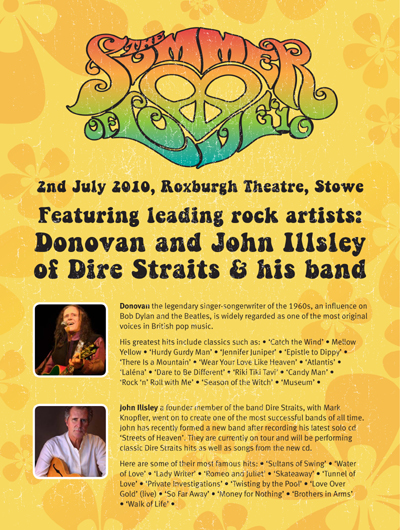 Last Friday the 2nd of July, Donovan joined John Illsley (Dire Straits) on stage at a charity concert for David Wynne's statues of the Beatles, in Stowe, England. Under the name of "The Summer of Love", this concert was only announced through Stowe's website. We're very sorry we didn't learn about it before, since many fans around the area would have loved to attend.